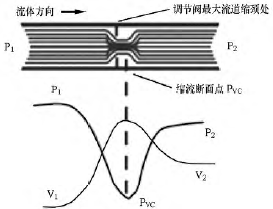 圖1為液體流經調節閥時壓力和流速間的關系圖示。圖中P1為閥前液體壓力,P2為閥后液體壓力,V1為閥前液體速度,V2為閥后液體速度,PVC為縮流斷面點處液體壓力。
