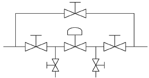 調(diào)節(jié)閥在使用過(guò)程中難免會(huì)出現(xiàn)些問(wèn)題,為能及時(shí)處理調(diào)節(jié)閥故障隱患,在工藝管路上一定要增加旁路閥與前后截止閥,以便能將調(diào)節(jié)閥從工藝系統(tǒng)中切除處理。而在切斷管路時(shí)管內(nèi)不可避免的積有帶壓流體,因此必須在調(diào)節(jié)閥前后裝設(shè)放泄閥,如圖1。