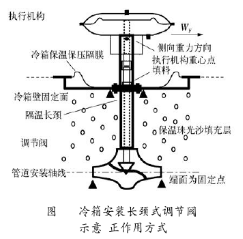 b)低溫(小于-100℃)深冷使用環境中,出現較多的也是填料泄漏故障。此類調節閥有較長的隔熱絕冷長頸,所處的環境溫差大,大多安裝使用在空分、液氮洗單元裝置上,它們基本上都有兩個支撐點,如圖3所示。管道和冷箱箱壁都是固定點,一端固定在管道、設備上,另一個就固定在保溫冷箱的邊壁上,閥體和長頸部分基本是固定死的,只有執行機構是側懸在冷箱壁之外的,如果執行機構太重并發生形變,受力點就在填料處,則填料處最易受力單邊磨損??辗?、液氮洗(深冷)單元除箱頂安裝的調節閥以外,基本上都屬側裝和水平安裝。如:合成氨液氮洗裝置的調節閥,空分裝置的調節閥。