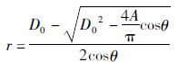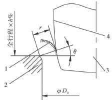確定閥門流量系數(shù)CV值后按式(3)計(jì)算出A0,然后根據(jù)式(4)針對(duì)閥瓣某一閥瓣開(kāi)度h%時(shí)計(jì)算出調(diào)節(jié)閥的閥瓣型面所形成的等效節(jié)流流路的面積A。按照?qǐng)D1所示閥座密封點(diǎn)處畫(huà)出一條射線段使其與水平夾角為θ,長(zhǎng)度為r。假設(shè)此點(diǎn)剛好為此閥瓣開(kāi)度h%時(shí)閥瓣型面上的點(diǎn),即此射線段所形成的圓臺(tái)側(cè)面積與A值一樣,即有
