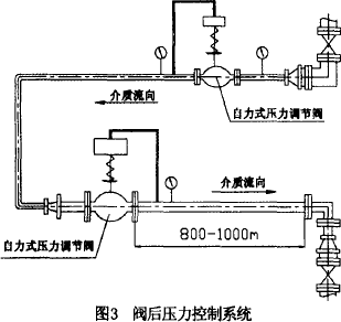 控制系統(tǒng)為穩(wěn)定閥后壓力的系統(tǒng),介質為氮氣,系統(tǒng)的初始管道壓力為2800KPa,后工段所需要的最大流量為2000NM3/h。工藝要求是后工段使用介質10分鐘后停止使用1小時,并按此方式循環(huán)使用;正常使用時閥后壓力穩(wěn)定在700KPa,停止使用時閥后壓力不得高于800KPa。閥后輸送管道長度為800~1000米左右(如圖3所示)。