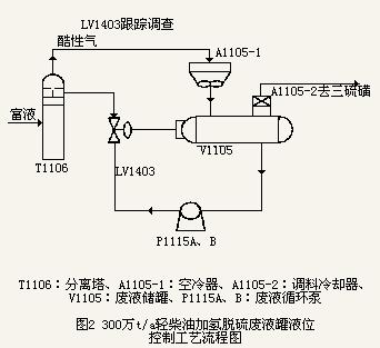 新型陶瓷內(nèi)件調(diào)節(jié)閥于2001年11月在某煉油廠300萬t/a輕柴油加氫脫硫廢液罐液位控制系統(tǒng)中應(yīng)用(圖2),系統(tǒng)正常運行至今,表明新型閥門經(jīng)受住該處流體的強(qiáng)腐蝕作用,確保了生產(chǎn)的正常安全運行,并節(jié)約了大量維修更新閥門的費用。