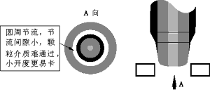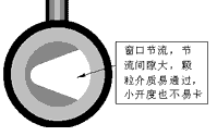介質(zhì)流經(jīng)節(jié)流口時(shí),在同樣的節(jié)流面積條件下,如果節(jié)流間隙小,不干凈介質(zhì)不易通過(guò), 容易堵塞;反之,則不易堵塞。對(duì)柱塞型閥芯(見圖六),它的節(jié)流面積分布在圓周上, 其節(jié)流間隙大概等于面積除以圓周長(zhǎng);再看窗口型閥芯(見圖七),其面積分布在窗口上 而不是在整個(gè)圓周上,所以其間隙大,顆粒很容易通過(guò)。由此可見,節(jié)流面積越集中(不是圓周分布),節(jié)流間隙越大,防堵性能就越好。這樣的典型產(chǎn)品有“V”型球閥、全功能超輕型調(diào)節(jié)閥等。尤其在小開度工作時(shí),前者的節(jié)流間隙更小,更易堵卡;后者集中在“V”形口的尖端部份,面積集中,充分顯示了“V”形節(jié)流的防堵優(yōu)勢(shì)。 | ||||||