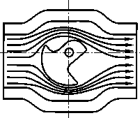 (2)角行程的閥克服了直行程閥流路復(fù)雜和上下導(dǎo)向易堵卡的問(wèn)題,介質(zhì)流經(jīng)角行程類 的閥,似乎是直接流進(jìn)流出,最典型的就為“O”型球閥,就象直管道一樣,其防堵性能最好, (見圖三);其次就是全功能超輕型閥、蝶閥等,它們的節(jié)流形式見圖四、五。 | ||||||